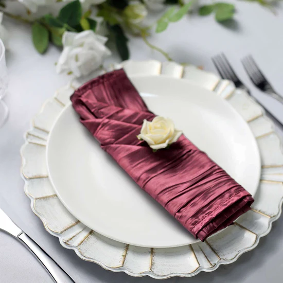 Crafted with attention to detail, these napkins exude luxury. The crinkles accentuate the surface, creating a visually captivating effect. The metallic glint of the lustrous taffeta fabric adds an imperial touch, leaving your guests in awe. Fold these napkins in stylish designs to impress your guests and create a memorable dining experience. With our Burgundy Accordion Crinkle Taffeta Cloth Dinner Napkins, your event will be elevated to new heights of elegance and style.