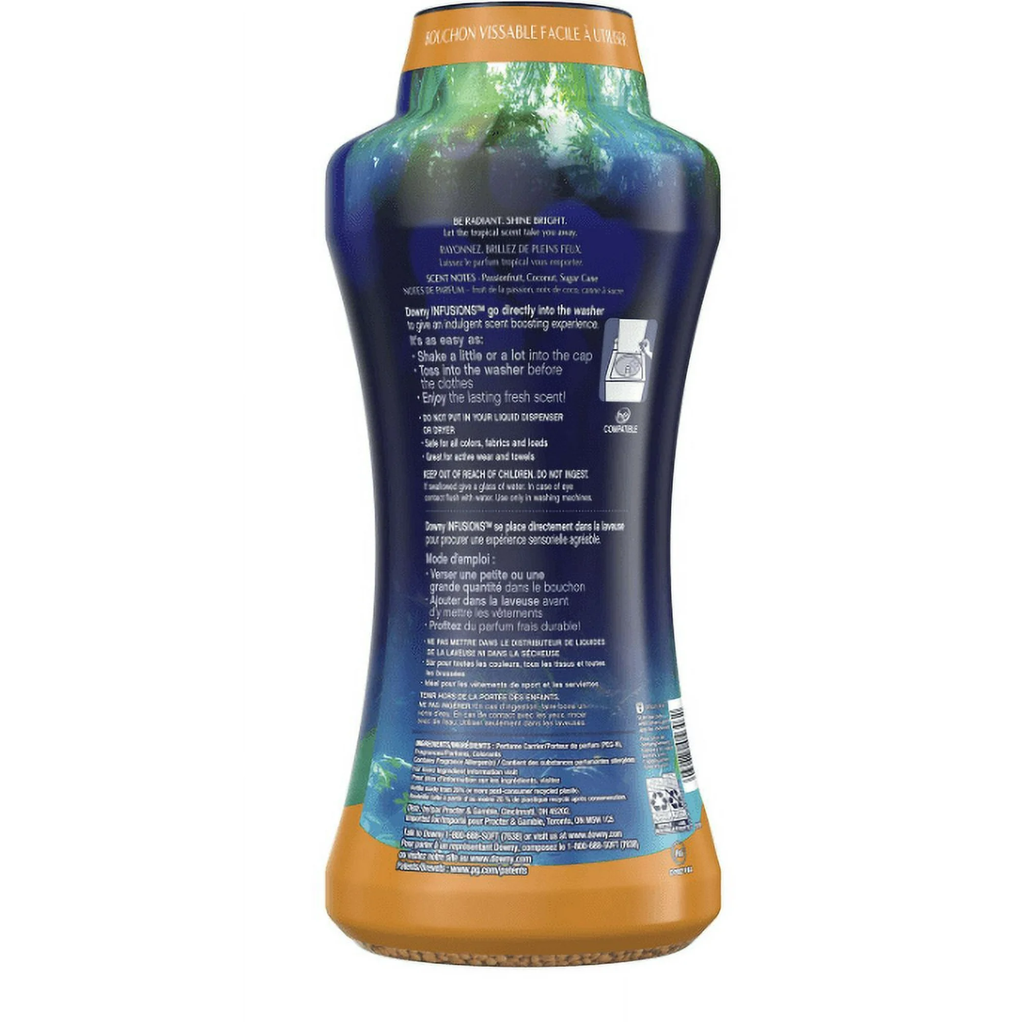 Downy Infusions Radiant In-wash Scent Booster Beads Pineapple & Coconut (37.5 Oz) Be radiant, shine bright. Let the tropical scent of Downy Infusions Radiant In-wash Scent Booster Beads take you away! This exclusive scent delivers a tropical combination of pineapple, passionfruit, coconut, and sugar cane, making your clothes truly smell as radiant as they look. Downy Infusions Radiant In-wash Scent Booster Beads are safe for all fabrics, free of dyes, and washing machines, including HE.