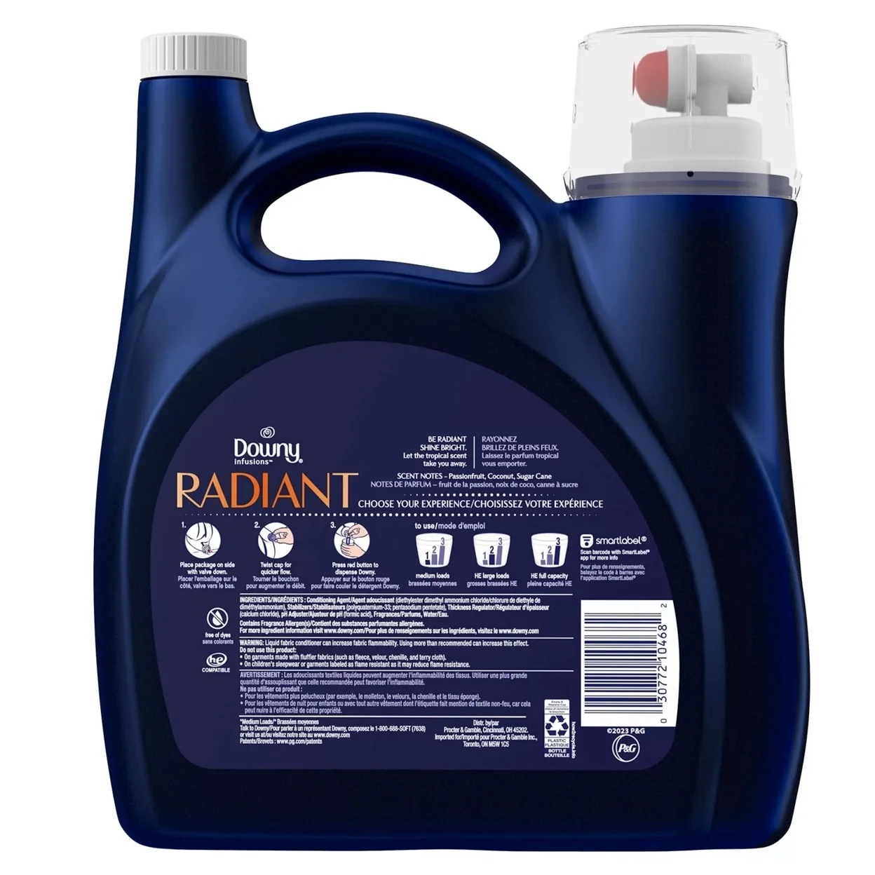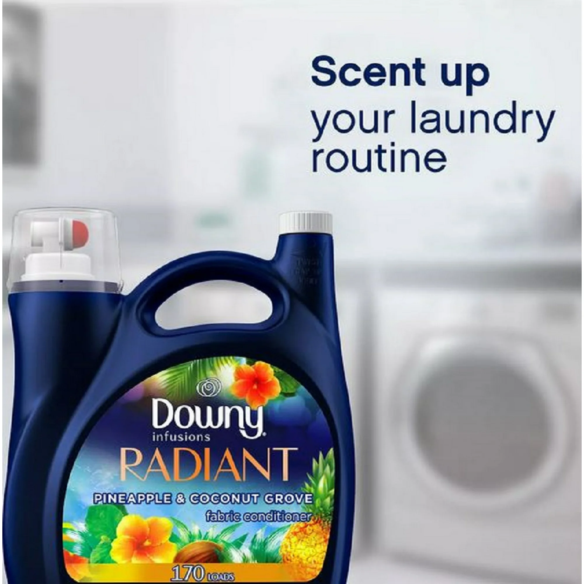Downy Infusions Liquid Fabric Softener, Pineapple & Coconut (115 Oz, 170 Loads) Be radiant, shine bright. Let the tropical scent of Downy Infusions Radiant Liquid Fabric Softener take you away! This conditioning fabric softener fights static and reduces more wrinkles than using detergent alone in the wash. This exclusive scent delivers a tropical combination of pineapple, passionfruit, coconut, and sugar cane, making your clothes truly smell as radiant as they look. Downy Infusions Fabric Softener is safe for all fabrics, free of dyes, and washing machines, including HE. But the very best part? It’s easy to use. Simply place the package on the side with the valve down, twist the cap for a quicker flow, and press down on the red button to dispense the Downy Fabric Softener. This 115 fl. oz., container of softener is enough for 170 medium-sized loads, allowing you to stay stocked up for a while, meaning less runs to the store for fabric softener. For medium loads, fill the cap to the first line, for HE large loads fill to the second line, and HE full capacity fill to the third line.
