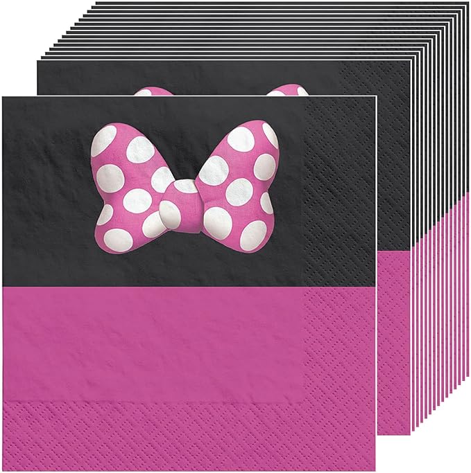 Our 1 pack Minnie Mouse Lunch Napkins (16 Pcs) is a great addition to your Disney-themed party. This lunch napkin features Minnie’s signature pink-and-white polka dot bow on a black and pink colorblock background. Use this product to complete your table settings and match your party theme. This product is made of 2-ply premium quality paper and measures 6.5×6.5 inches.