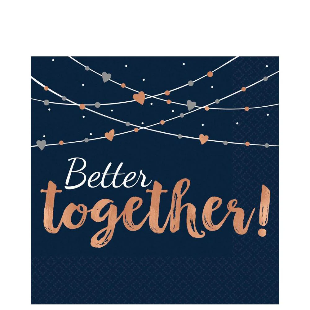 Create a neat ambiance for everyone in your celebration with this Navy Bride Hot Stamped Lunch Napkin. These navy paper napkins feature the headline “Better” in white and “together’ in rose gold color. It also displays an image of string decoration with hearts in it just above the headline. Add these along with other Navy Bride party collection to make the entire celebration extra special. Package includes 16 napkins.