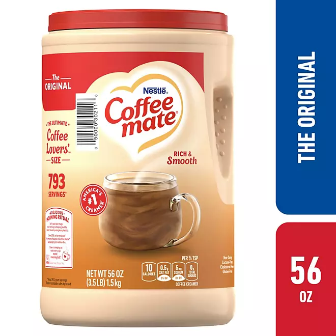 Nestle Coffee mate Original Powdered Coffee Creamer is an ideal way to create a delicious cup of coffee perfection. Smooth and rich, this original creamer delivers classic flavor that transforms every drinking experience. Original Coffee mate creamer is lactose free, gluten free and non dairy. Coffee creamer powder makes it easy to add the right amount of flavor every time, letting you easily transform your coffee into warm deliciousness. Whether it’s your morning cup or an afternoon pick-me-up, this flavored coffee creamer wakes up your coffee. Store Coffee mate powdered creamer in a cool, dry place.