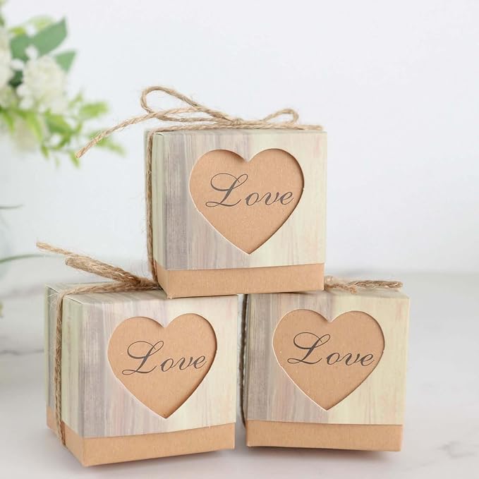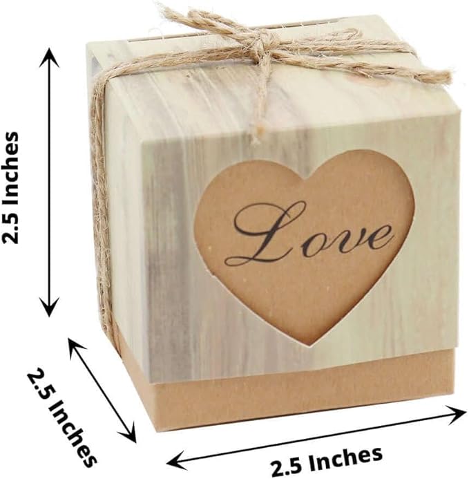 Spread love around and give away your sweet favor gifts wrapped up in our charming wooden textured favor boxes to touch your guests’ hearts. Fill them with assorted candies, almonds, chocolates, truffles, and other sweet delicacies, and watch their eyes twinkle with joy as soon as they receive one! Featuring a heart with “love” imprinted inside, these gift candy boxes are perfect for weddings, engagement parties, bridal showers, and Valentine’s Day.
